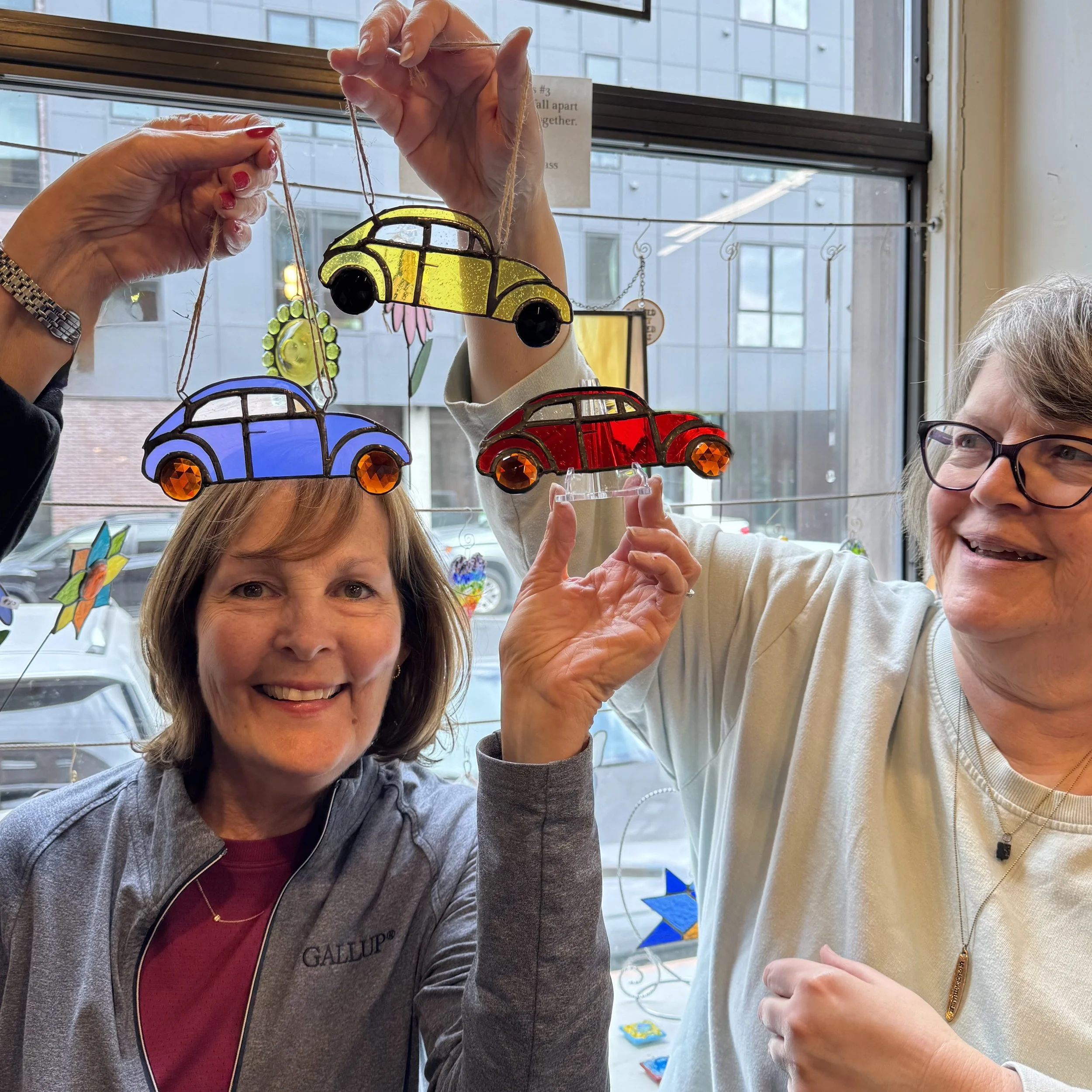 Private stained glass workshops are a fun, hands-on way to gather your favorite people and create something beautiful together. I offer private sessions for groups of six to eight, lasting two to three hours depending on the design. You can choose from any of my past class projects or request a custom design tailored to your group. All workshops take place in my studio at the Hot Shops Art Center, providing a creative and relaxed environment that’s perfect for friends, family, or even team-building with coworkers. No experience is needed—just bring your creativity you’ll leave with a finished stained glass piece you’ll be proud of.